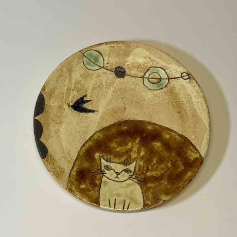 ネコさんがなんともとぼけた表情で登場する三つ足皿や小箱、壁掛け一輪挿しなどの器は親しみやすい作品。猫好きには堪らないことでしょう。